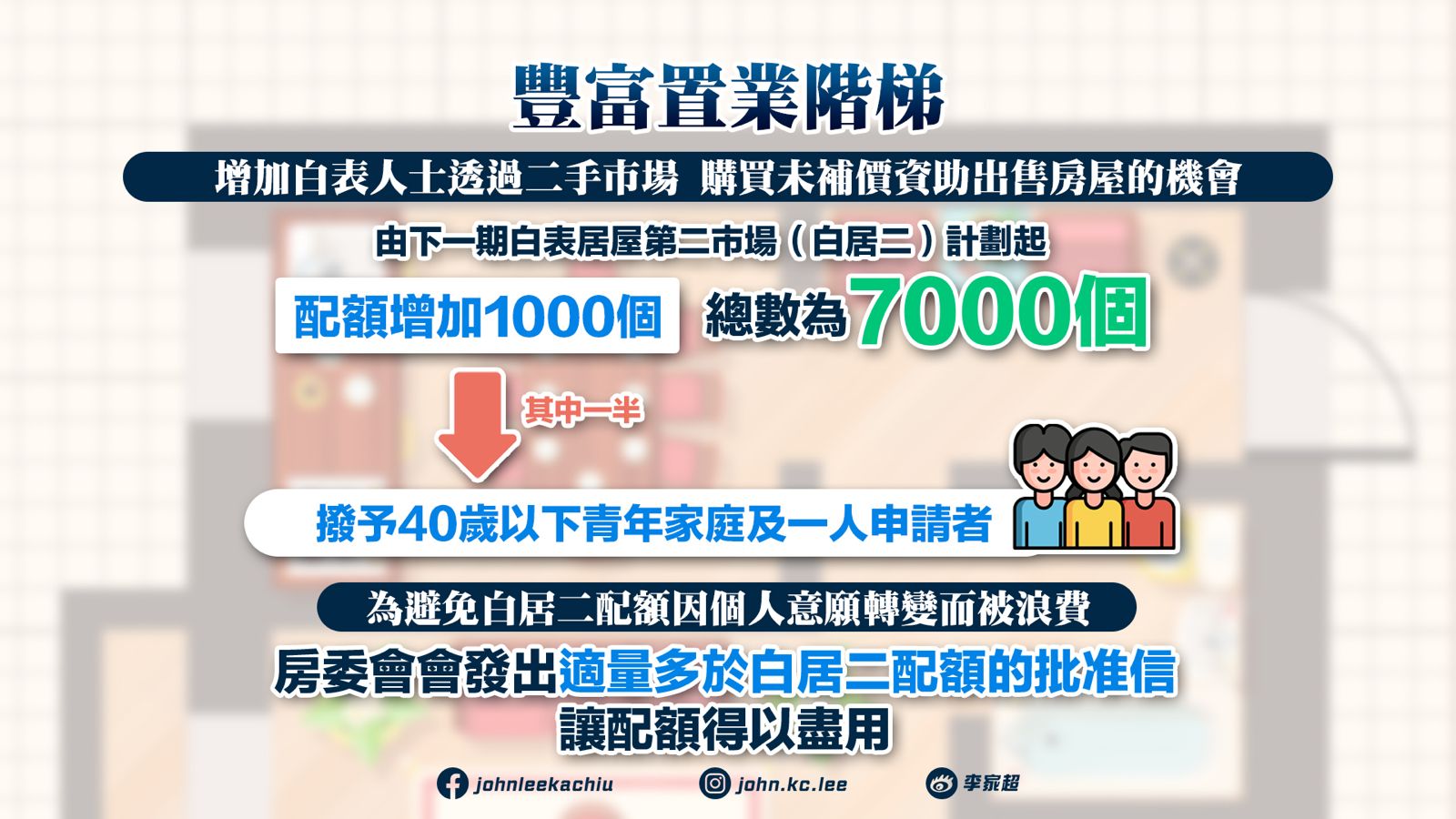 2、為增加白表人士透過二手市場購買未補價資助出售房屋的機會,房委會由下一期「白表居屋第二市場(白居二)計劃」起,再增加1000個配額,總數達7000個;1000個新增配額的其中一半會撥予40歲以下青年家庭及一人申請者。