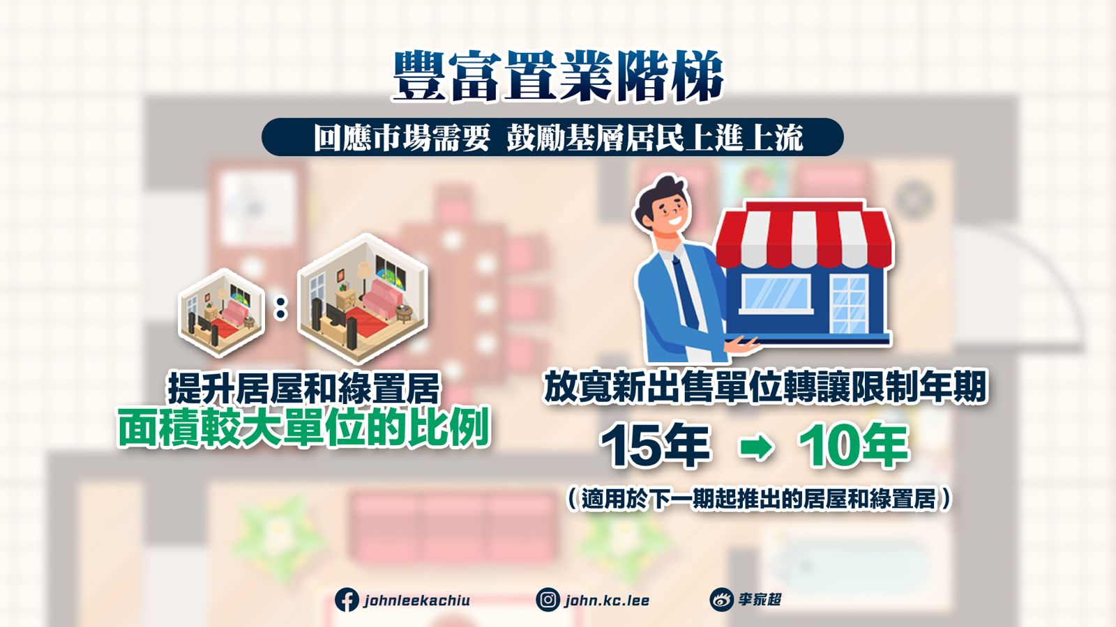 5、放寬新出售單位的轉讓限制年期由15年降低至10年,以鼓勵居民上進上流,適用於下一期起推出的居屋及綠置居。