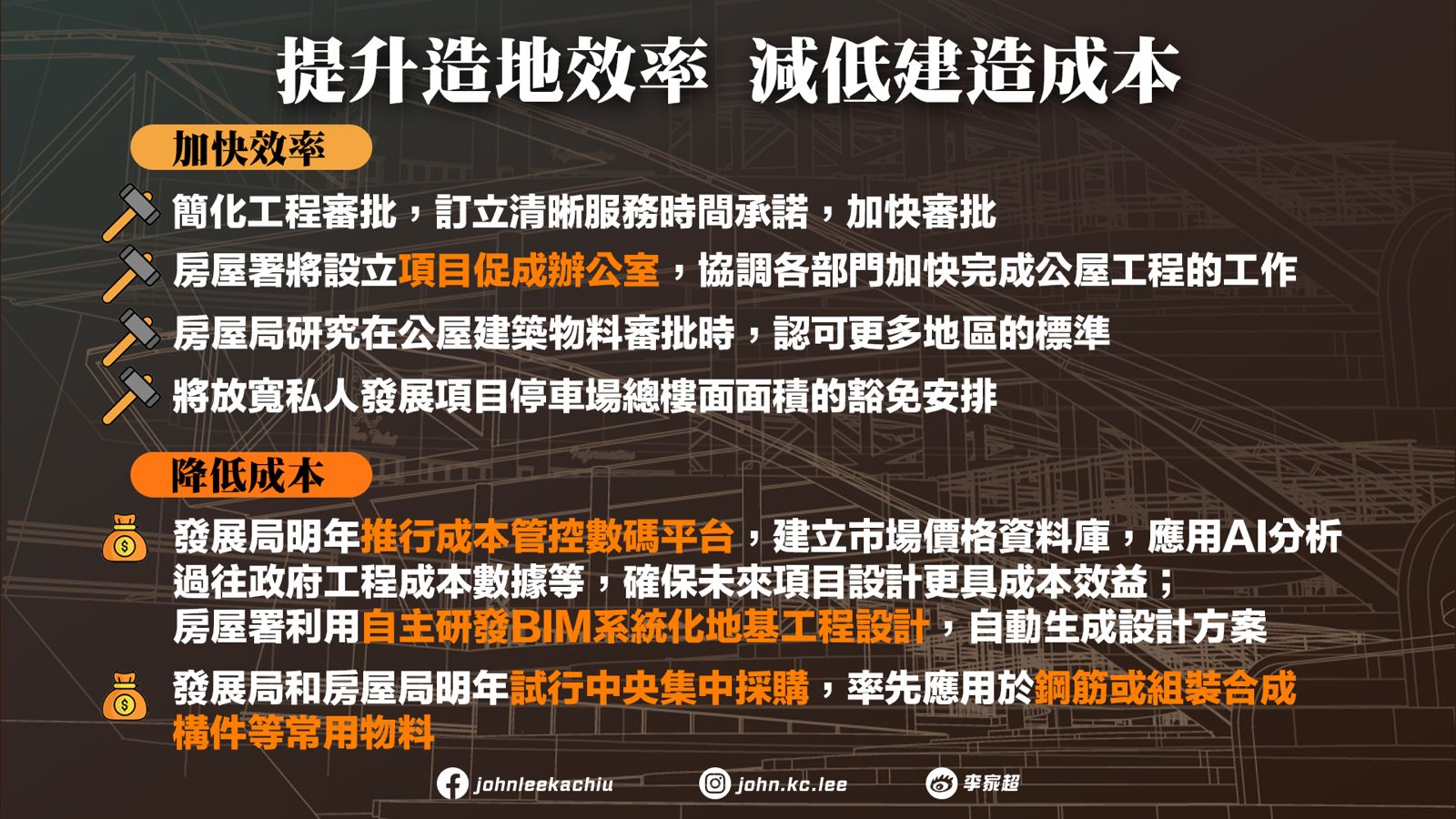 3、善用科技,發展局將於明年推行「成本管控數碼平台」,建立市場價格資料庫,並應用AI分析過往政府工程的成本數據等,確保未來項目設計更具成本效益。房屋署亦已利用自主研發的「BIM系統化地基工程設計」,自動生成設計方案,進一步節省成本。