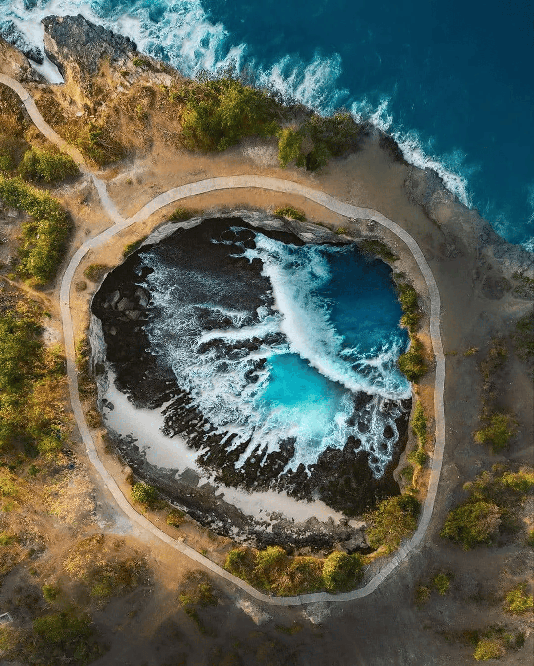 天仙裂痕海滩(Broken Beach)位于努沙佩尼达的西端,听名字就仙气十足,它是一座天然形成的海上拱桥,由火山地壳运动而形成的天然奇观,向外延伸的山崖下方形成了一个巨大的海洞,俯瞰就像海洋的大眼睛。