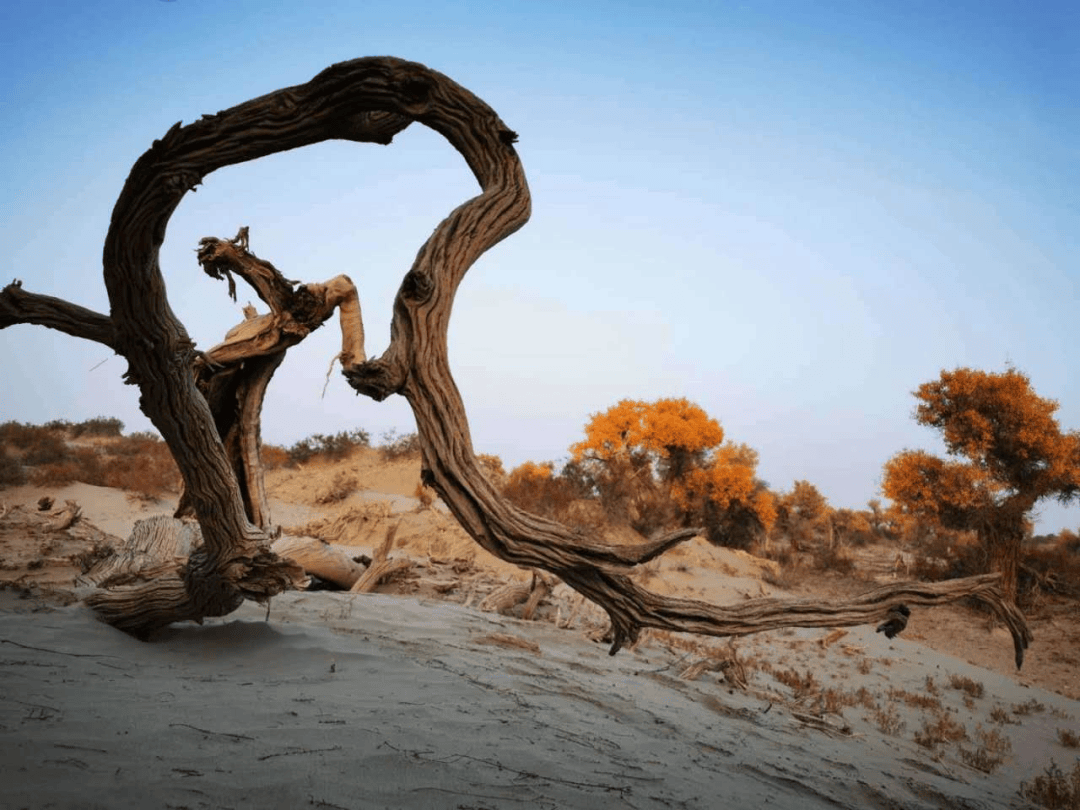 塔里木胡杨形态各异,有的如撑开的巨伞,有的似舞动的火焰,还有一些因长期受风而形成奇特的扭曲造型。在红柳滩区域,金黄的胡杨与紫红的红柳相映成趣,到了沙漠公路段,能看到胡杨用根系牢牢抓住流动的沙丘,展现出顽强的生命力。