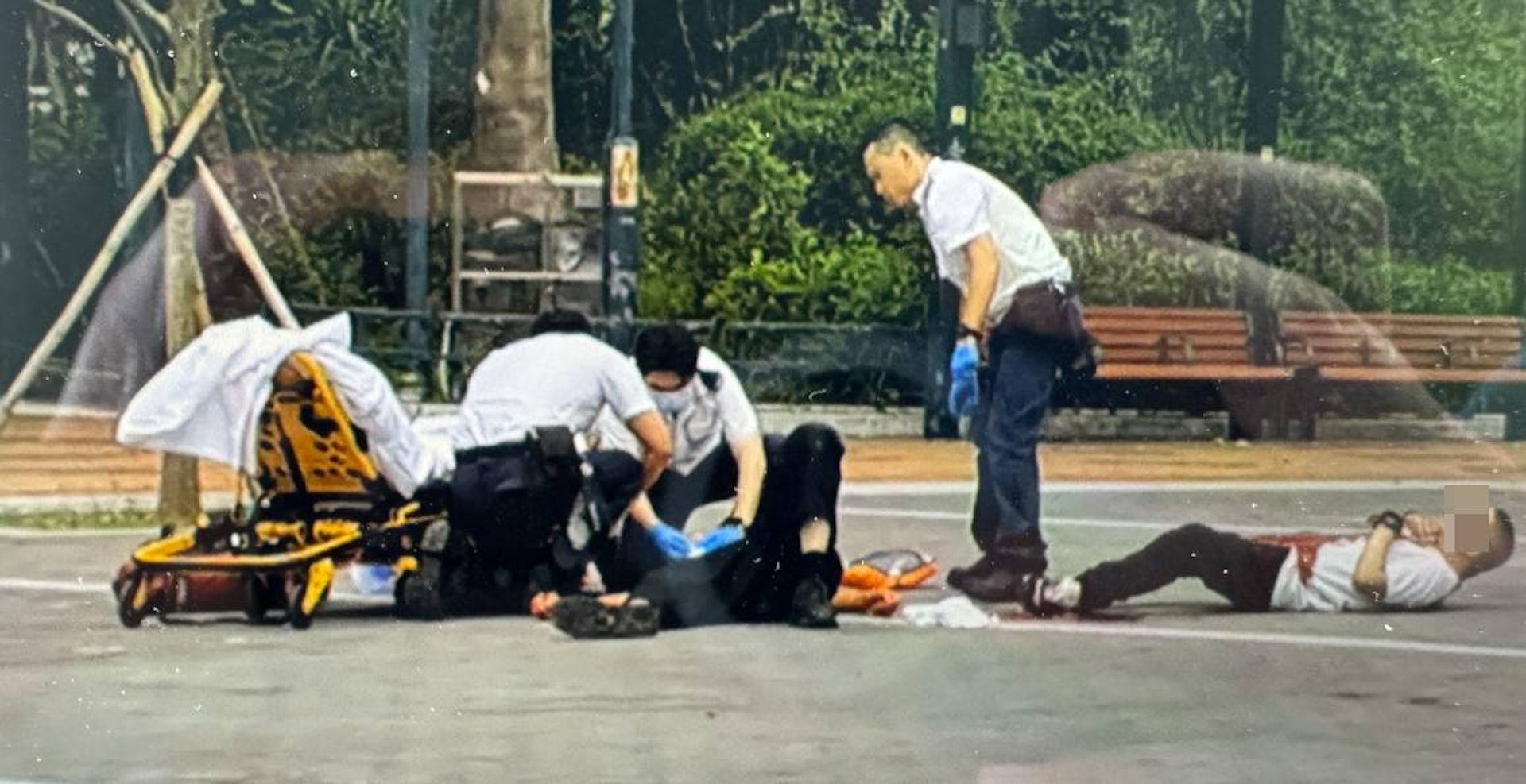 網傳片段顯示,救護員正為其中一名傷者包紮,他疑似昏迷、毫無反應;另一名男子倒地,衣服染血,雙手按着自己的喉嚨止血。