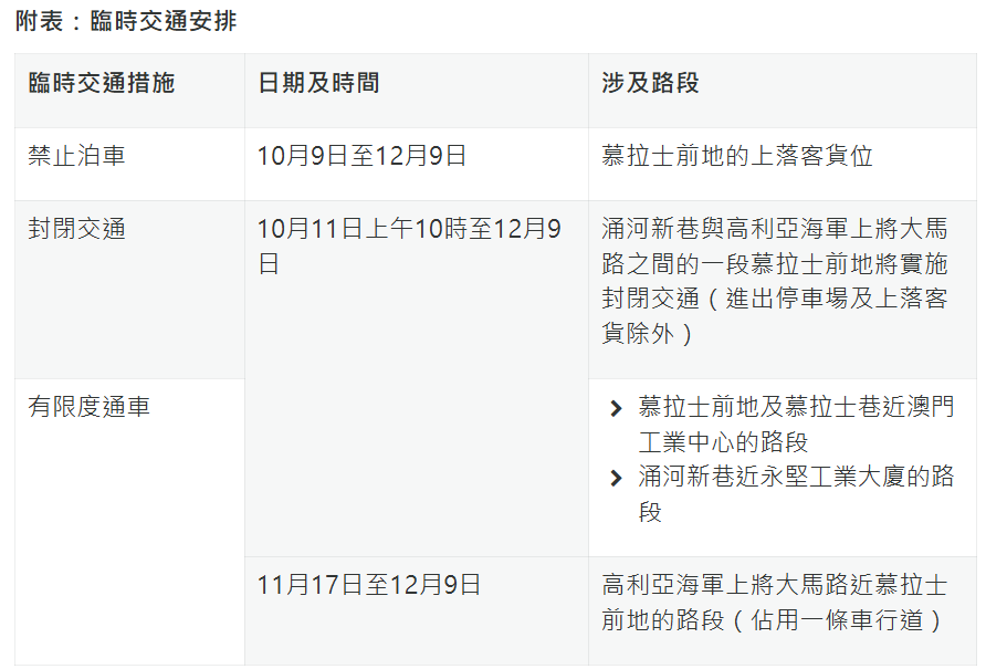 為優化慕拉士前地行人及行車出行環境,公共建設局與交通事務局將於10月11日(周六)起展開慕拉士前地道路整治工程,且為避免道路重複開挖,已同步協調各專營公司一併進行相關路段的工程。整項工程施工期為60個工作天。配合工程開展,介乎涌河新巷與高利亞海軍上將大馬路之間的一段慕拉士前地,於10月11日上午10時起實施封閉交通,周邊亦會實施相應的臨時交通安排(詳見附表),敬請公眾留意。