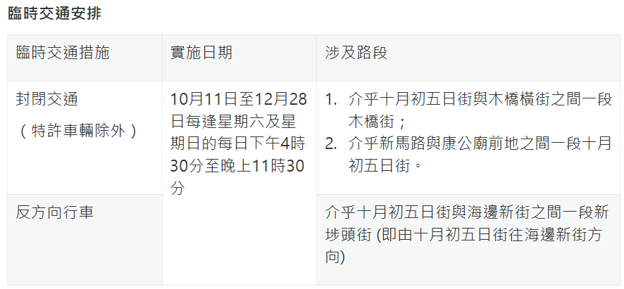配合澳門中區南區工商聯會舉辦活動,10月11日起至12月28日每逢星期六及星期日每日下午4時30分至晚上11時30分,十月初五日街一帶道路實施臨時交通安排,詳情可查閱附表。