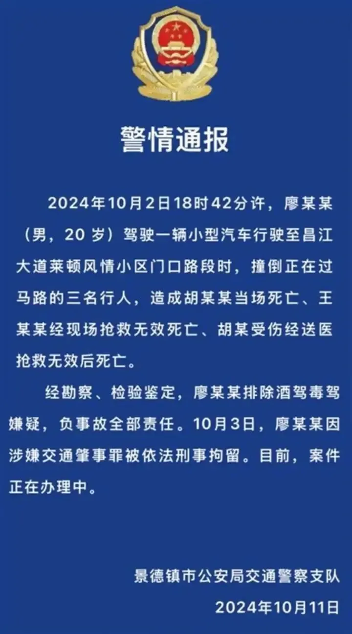 据景德镇市公安局交通警察支队通报,廖某某(男20岁)驾驶一辆小型汽车行驶至昌江大道莱顿风情小区门口路段时,撞倒正在过马路的三名行人,造成胡某某当场死亡、王某某经现场抢救无效死亡、胡某受伤经送医抢救无效后死亡。经勘察、检验鉴定,廖某某排除酒驾毒驾嫌疑,负事故全部责任。10月3日,廖某某因涉嫌交通肇事罪被依法刑事拘留。