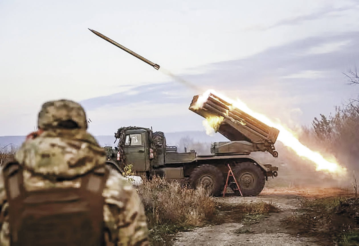 23日,乌军士兵在顿涅茨克州重要堡垒城市康斯坦丁诺夫卡用BM-21“冰雹”多管火箭炮向俄军开火。(图源:英媒)