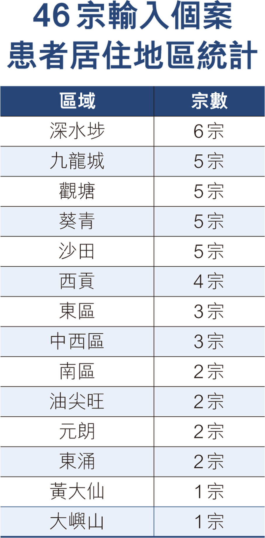 截至前日下午5時,本港今年共錄得46宗輸入個案,當中一名年長患者因併發多個器官衰竭死亡,其餘患者病況輕微。