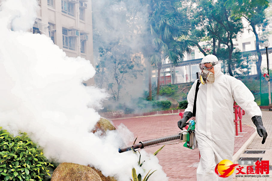 ●人員於屋邨附近噴滅蚊煙霧。香港文匯報記者李千尋 攝