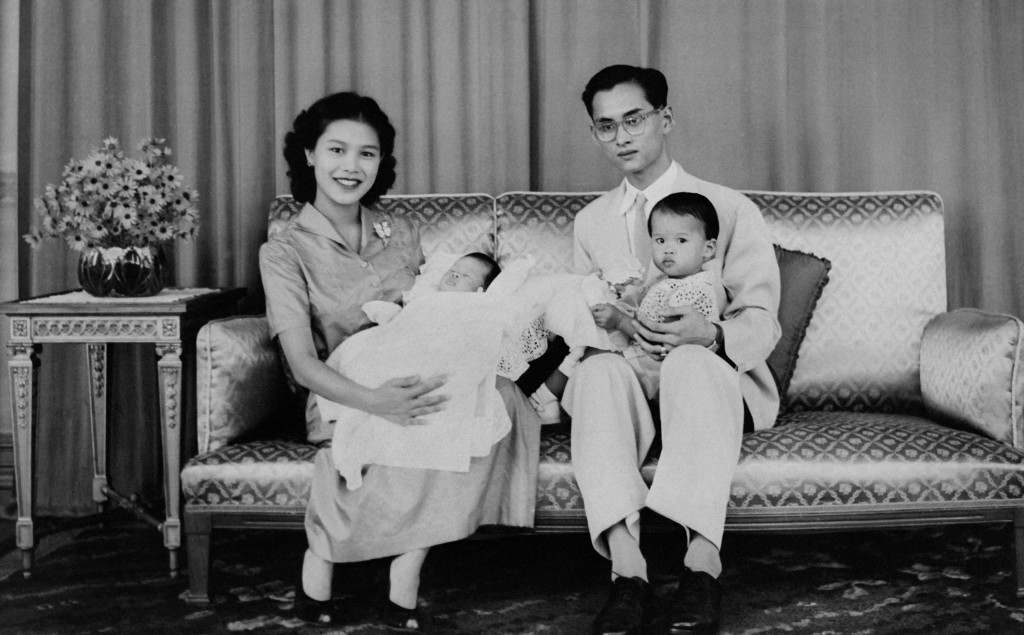 ▲诗丽吉与普密蓬手抱长子哇集拉隆功(右)及次女诗琳通(左)合照。法新社