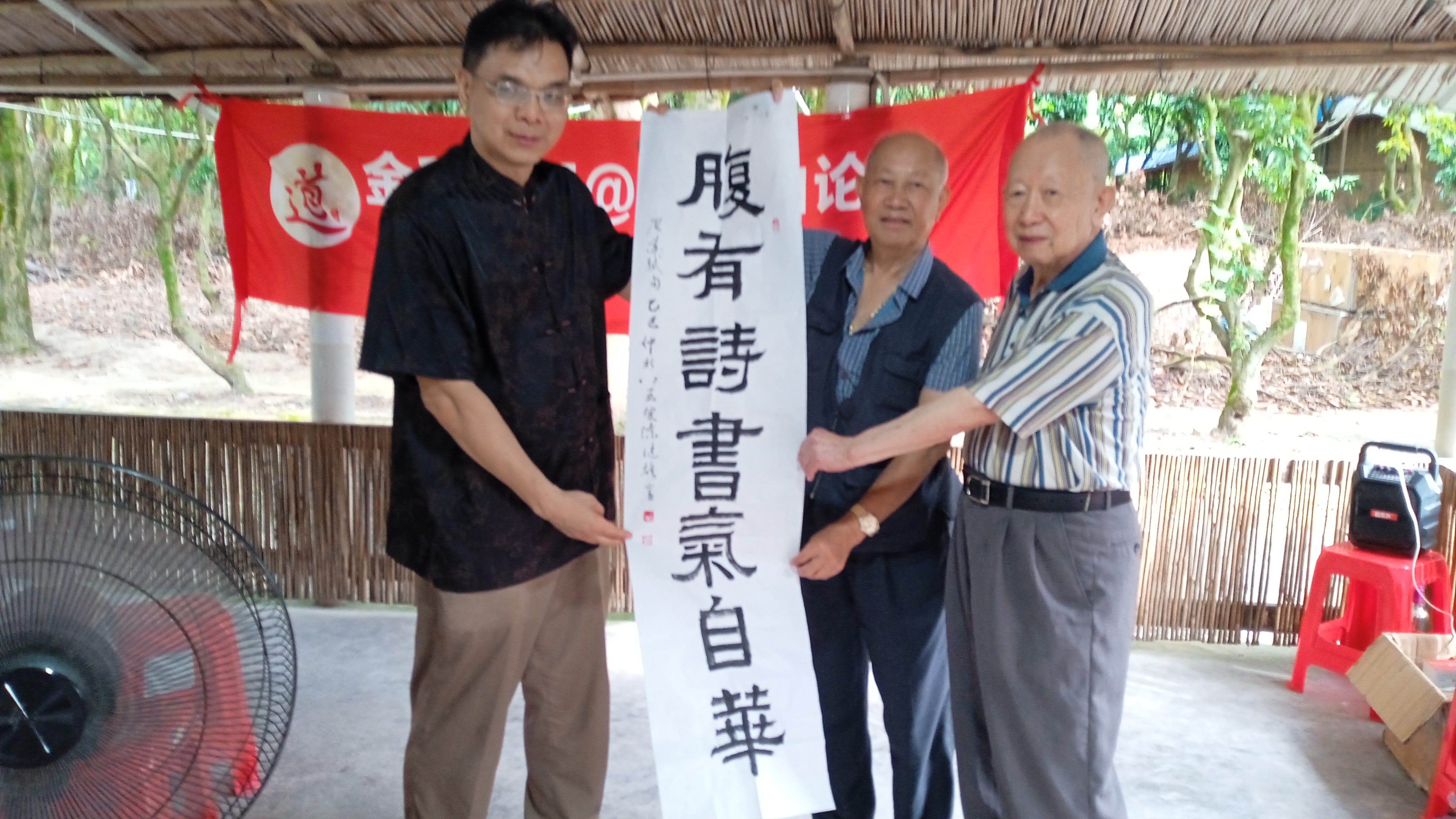 让人惊喜的是:珠海特区报原社长陈健雄老先生为人大校友朱博士赠送书法作品一幅,“腹有诗书气自华”几个端庄大气的隶书非常契合朱博士儒雅气质,获得众人一致好评!朱博道德经书屋香洲总社韩社长诵读《道德经活字记忆法》第一章到第五章,让人感受道家学派创始人老子“万经之王”的道法自然、无为而治等辩证法思想的神秘魅力。0