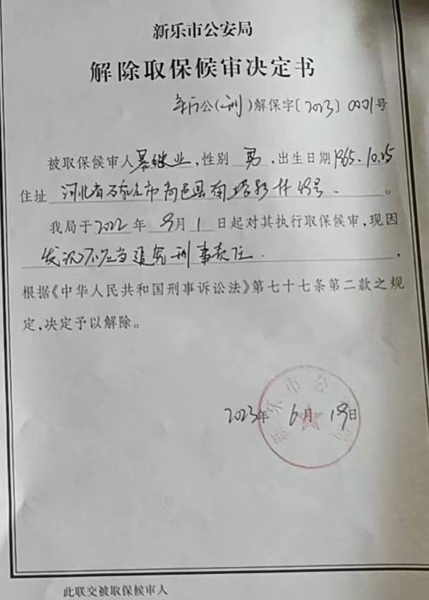 一个多月后的2022年9月,暴继业、暴记忠等9人被新乐市公安局取保候审,次年6月被解除取保候审。警方文书载明了解除取保的理由:“发现不应当追究刑事责任”。