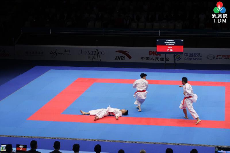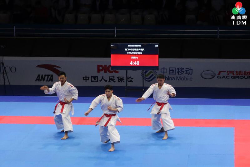 賽事在綜藝館舉行,行政長官岑浩輝亦有到場觀看決賽,在杭州亞運會曾奪銀牌的澳門隊3名運動員郭建恆、方文浩及鄭沘珞,與香港隊爭冠軍的賽事,表現出色,結果以42.7分比40.4分擊敗香港,勇奪冠軍。澳門隊在今次賽事先後擊敗北京、貴州、山東和香港,亦是今屆全運會澳門賽區展開首日比賽,在空手道的業餘組團體型項目,勇奪金牌。