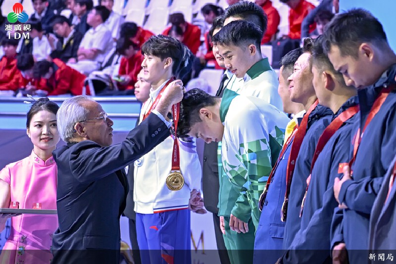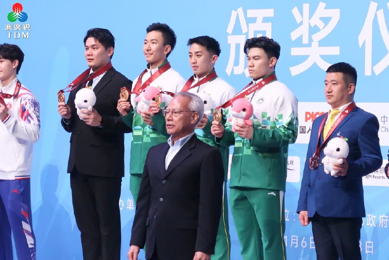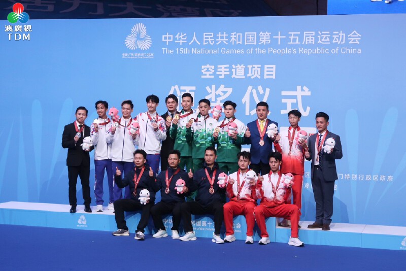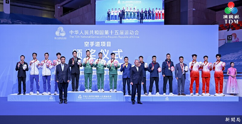在第十五屆全運會空手道比賽男子業餘組團體型的項目,澳門代表隊連勝 4場,奪得金牌,頒獎儀式由行政長官岑浩輝主持。