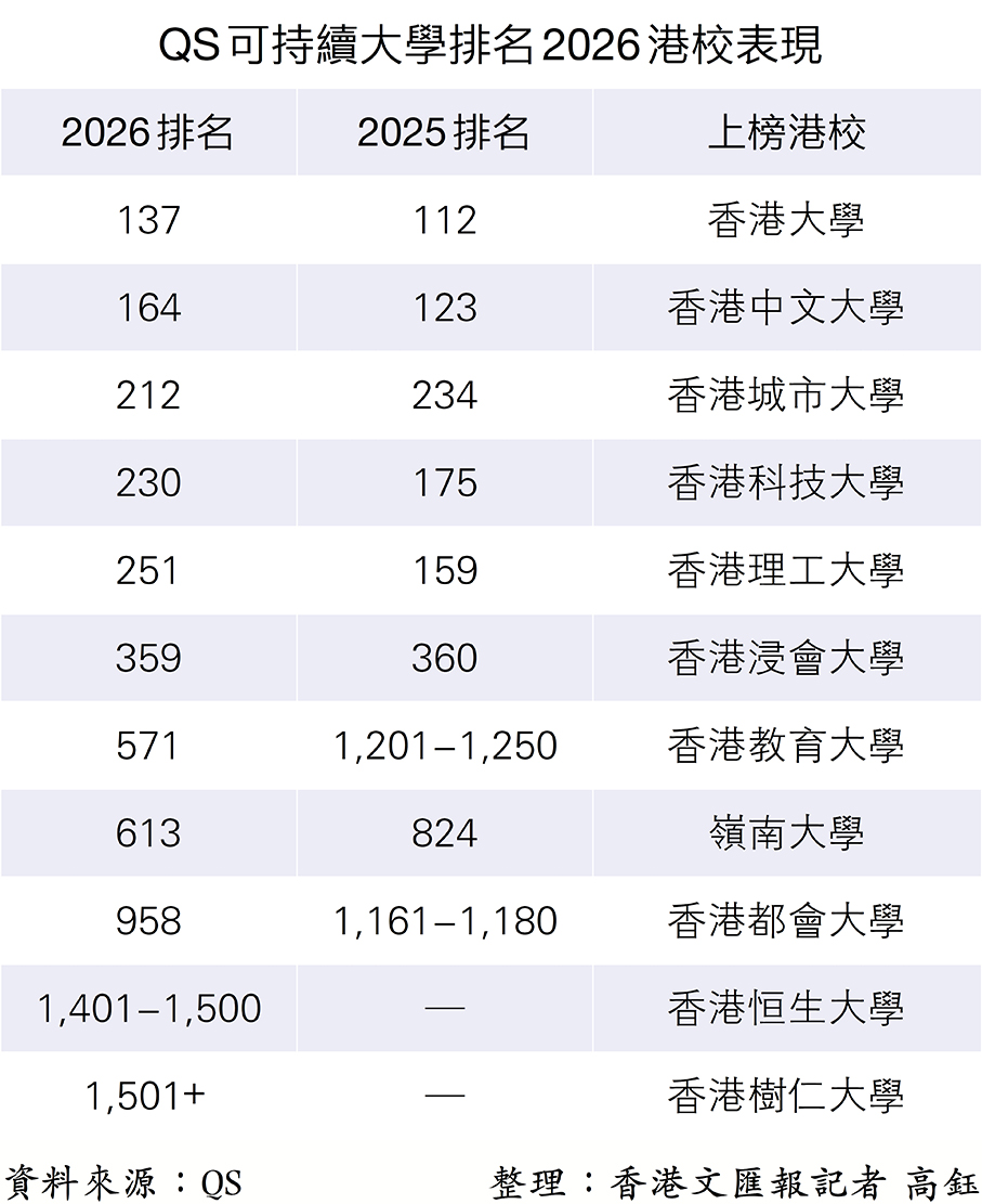 香港文匯報訊(記者 莫楠)國際高等教育排名機構Quacquarelli Symonds(QS)昨日公布最新的2026可持續發展大學排名。香港共有11所院校入榜,其中5所排名上升,另有兩所首次入圍,整體表現穩中有進。其中,香港大學位列第一百三十七位,繼續位居本地榜首,亞洲則排第十,其中環境研究與知識交流相關指標表現突出,就業機遇分項更列全球第二。香港教育大學大急升逾600名至第571位,為全球升幅最大的院校之一。QS表示,有關成績反映香港院校在聯合國可持續發展目標(SDG)相關研究、社區參與及課程改革等方面持續推進,配合本地政策議程,推動高等教育可持續發展。