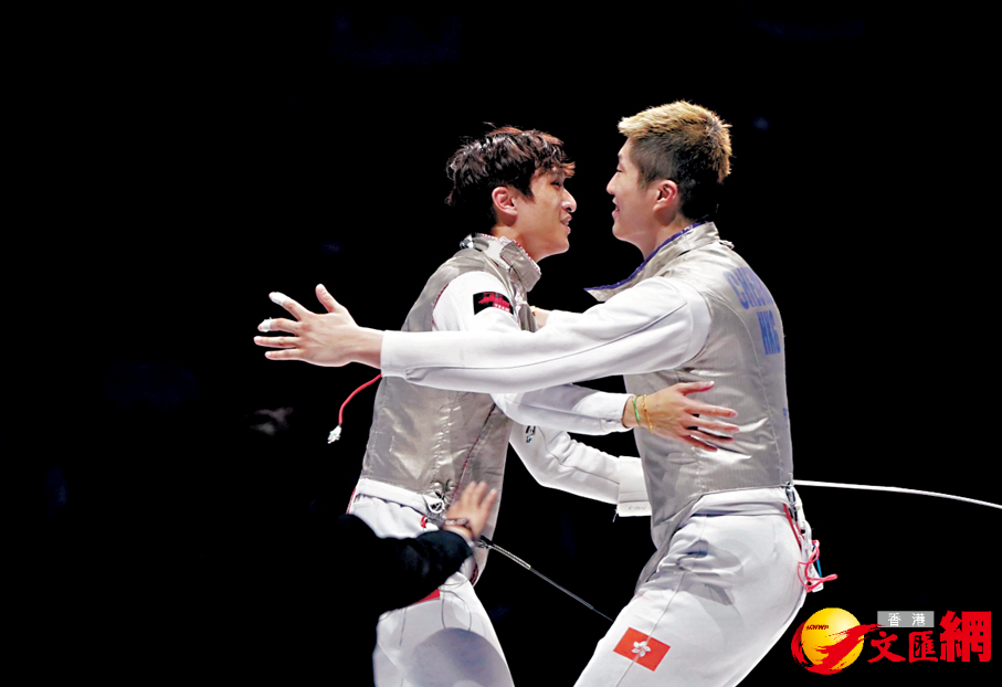 ●蔡俊彥(左)與張家朗賽後擁抱慶祝。 香港文匯報記者郭正謙 攝