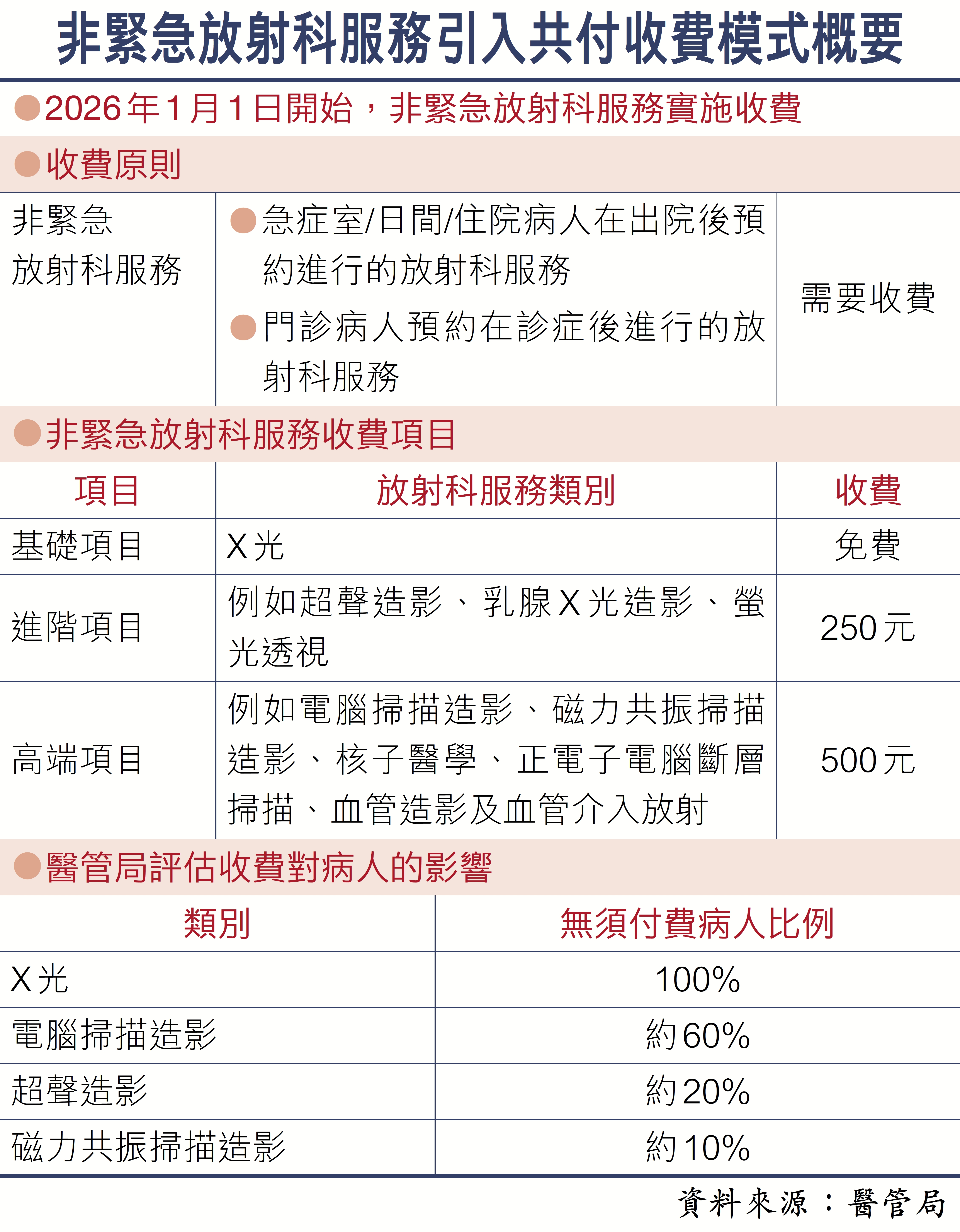 醫管局因應資源,會優先為緊急及危重病人提供即時服務,而非緊急放射科服務引入共付收費模式後,基礎的X光服務仍然免費,其他進階服務項目如超聲造影等則要收取250元費用,而高端項目包括電腦掃描造影及磁力共振掃描造影等,則要收取500元。局方評估,仍有六成病人接受電腦掃描造影時無須額外繳付費用,而接受磁力共振掃描造影的病人則有一成無須額外繳費。