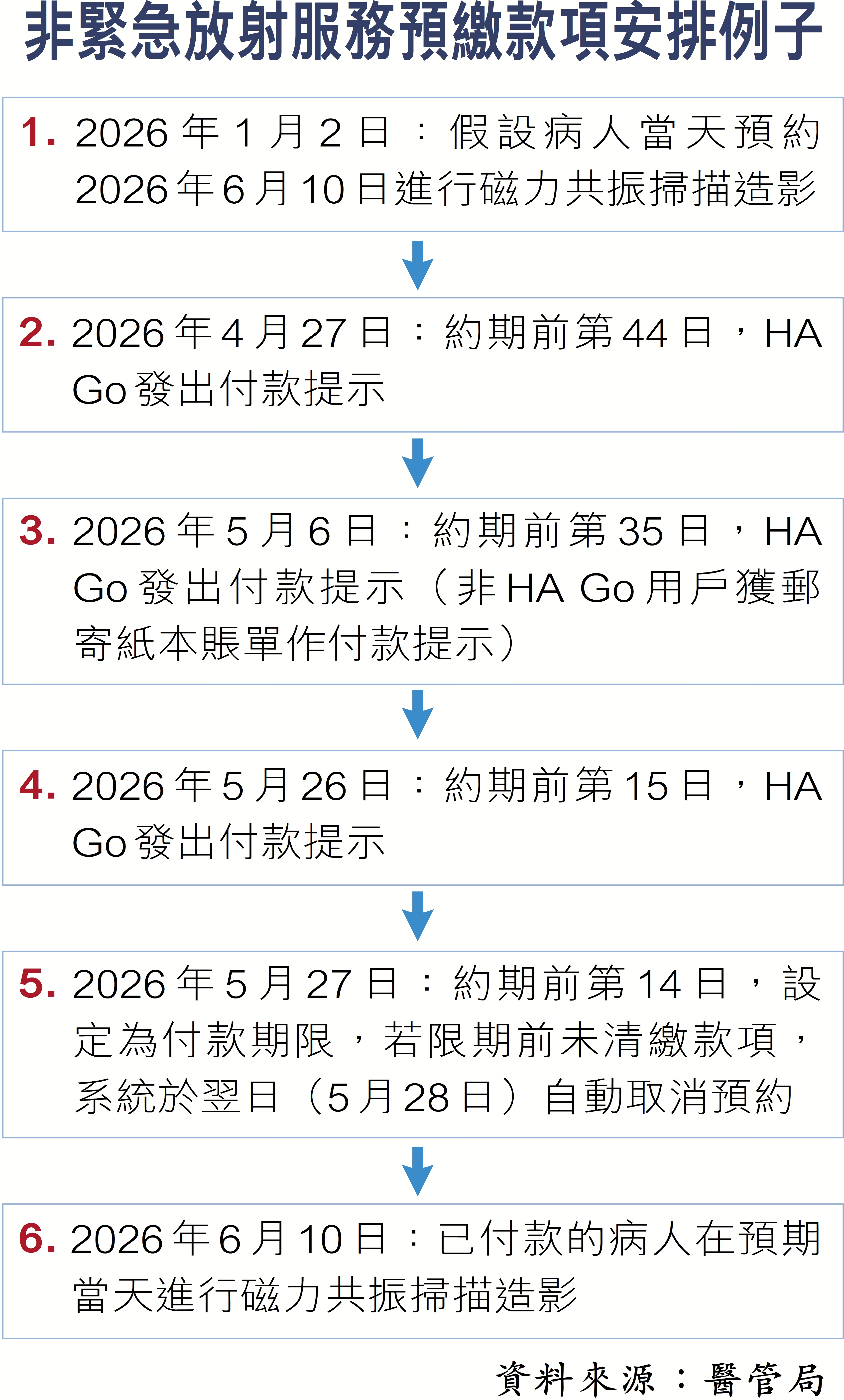 病人在預約接受放射科服務後,須於預約日期前最少14天完成付款,HA Go手機程式將在付款限期前發出最多三次付款提示,倘病人未於付款限期前清繳款項,系統將於翌日自動取消預約,放射科部門會將預約時段分配給其他病人。若需要重新預約,則先由相關醫生根據臨床情況評估是否需要重新轉介申請放射科服務,放射科部門會進行新的預約排期。