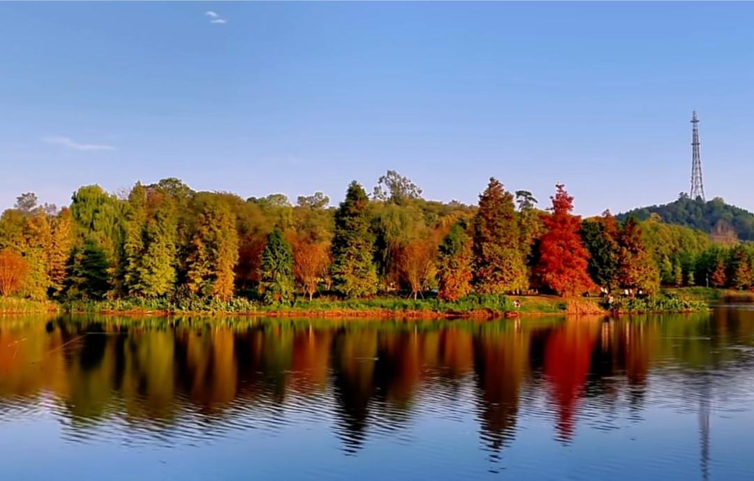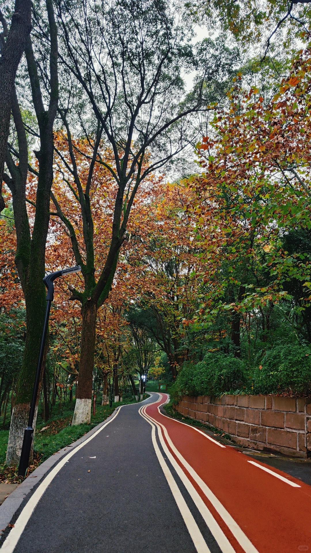 作为德阳人民的后花园,东湖山公园有沿湖沿山几公里的健身步道,满山绿植郁郁葱葱,正值深秋,梧桐叶已黄,已红,倒映在碧绿的湖水里,是一幅暮秋的油画,站立在路边,是浪漫的卫士。