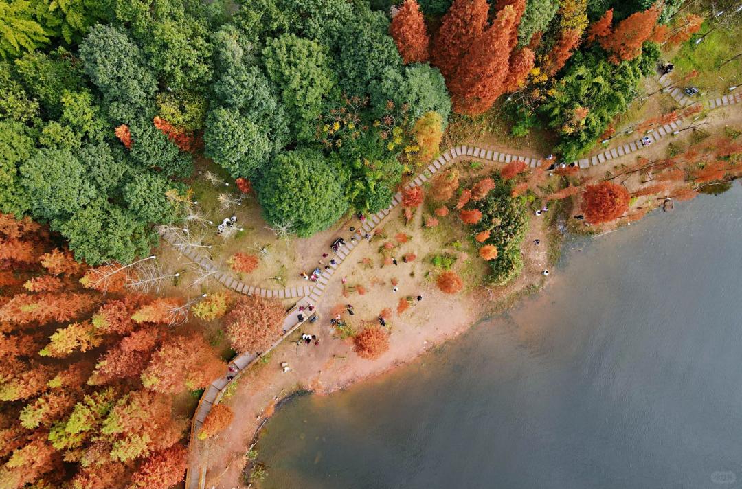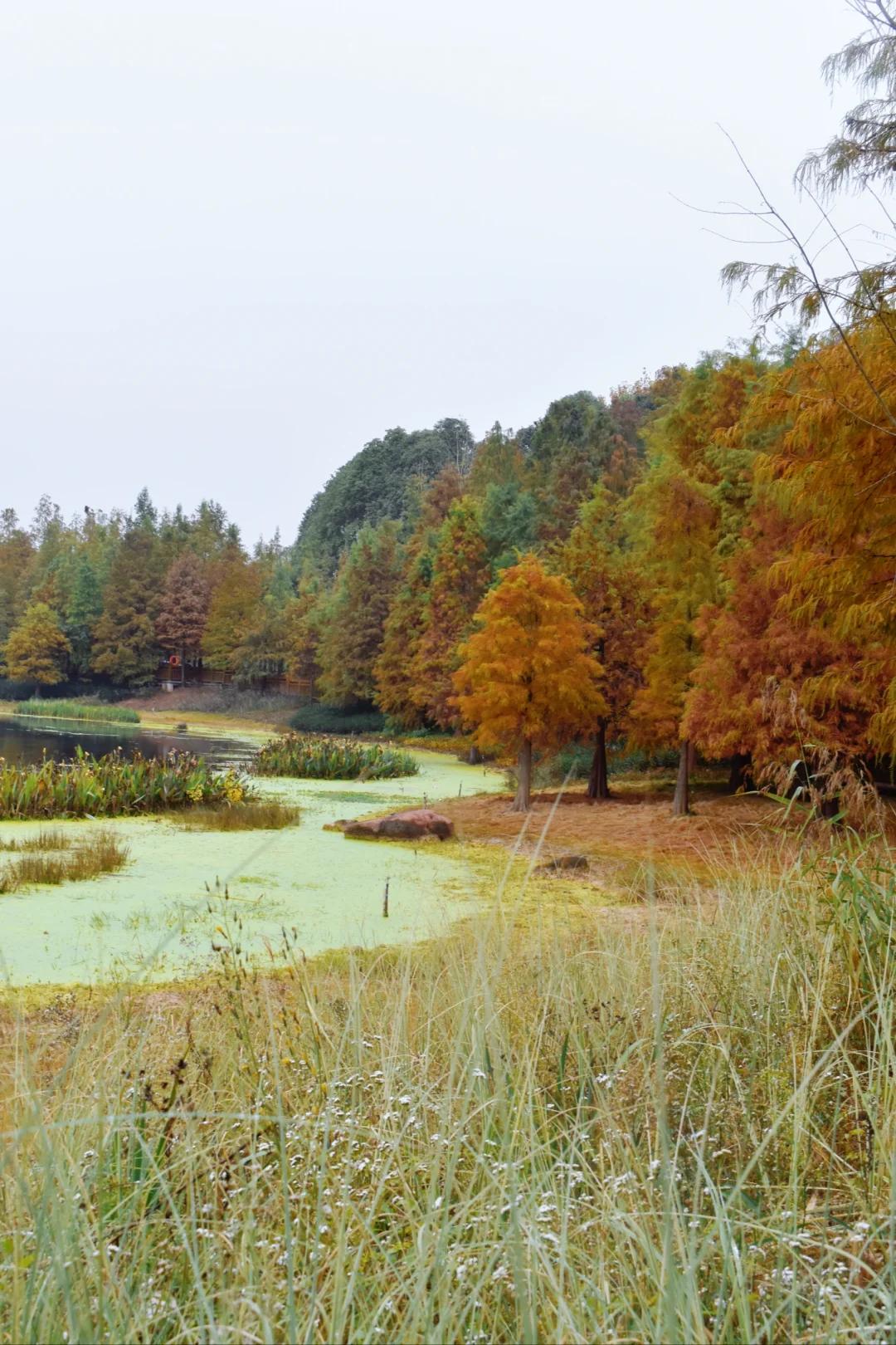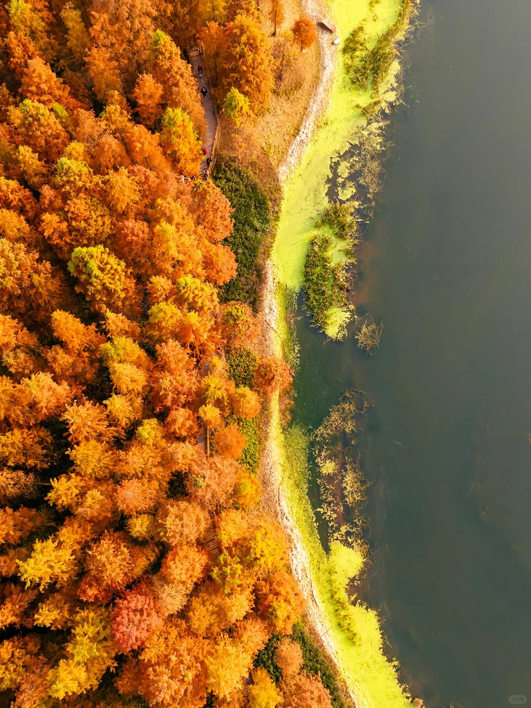 湖边的水杉也开始褪去身体里的叶绿素,呈现黄橙红奉, 为秋天添姿添色,走进沿湖栈道,随手一拍就是大片!