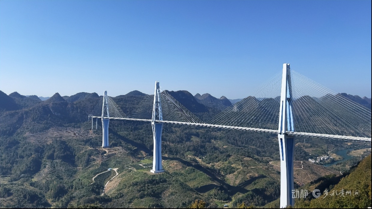 站在“天空之桥”服务区远眺,蓝白色调的平塘特大桥,飞跨在槽渡河峡谷之间。桥梁全长2135 米,主塔高达332米,是世界第一高的混凝土桥塔。“钻石形”设计的桥塔与两侧高山遥相呼应,实现桥梁功能性与美学的平衡。