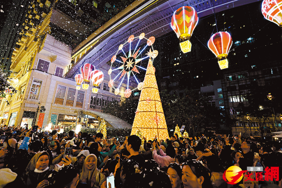 ●利東街打造歐洲聖誕市集,中庭有懸浮LED摩天輪及8米高聖誕樹,每晚上演大型戶外飄雪匯演,並打造歐陸文化市集,不少遊客紛紛慕名而來。 香港文匯報記者黃艾力 攝