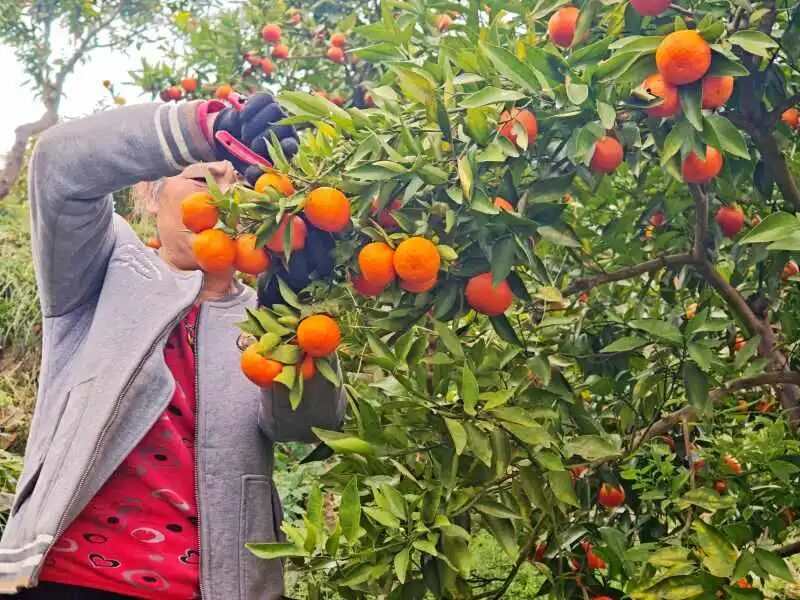走进渡江社区的圳兴绿产水果基地,采摘工人正穿梭林间,一手扶果、一手持剪,熟练地将成熟的橘子采摘下来装入背夹,随后陆续运往称重处集中分拣,现场一派繁忙景象。