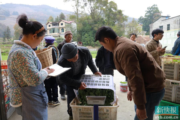 村民正在称重、打包豌豆尖。