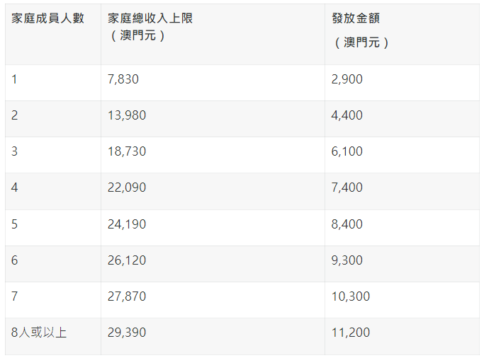 根據第135/2025號社會文化司司長批示,自2026年起,“社會融和計劃”向1至8人家團發放的金額調升至2,900至11,200澳門元不等。2026年度第一期“社會融和計劃”將於1月7日至2月13日期間接受申請,社會工作局經審批有關申請後,將於5月及10月向合資格的家庭發放合共兩期特別援助金。而現正收取《弱勢家庭特別援助規章》三類弱勢家庭特別補助的家庭無須提出申請,可自動獲發“社會融和計劃”款項。有關計劃的家庭總收入上限及發放金額如下: