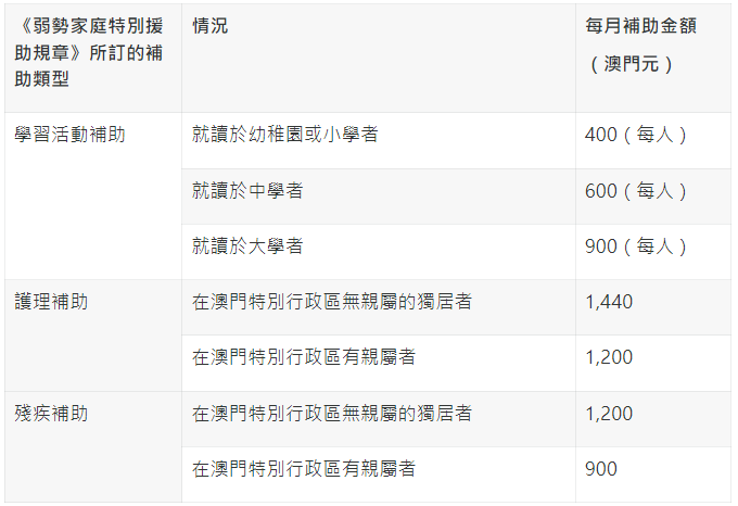根據第136/2025號社會文化司司長批示,自2026年起,《弱勢家庭特別援助規章》所訂的三類弱勢家庭(單親、殘疾及長期病患者家庭)的特別補助金額亦同步調升,其中學習活動補助調升為每月400至900澳門元;護理補助調升為每月1,200至1,440澳門元;殘疾補助調升為每月900至1,200澳門元。有關補助類型及金額如下︰