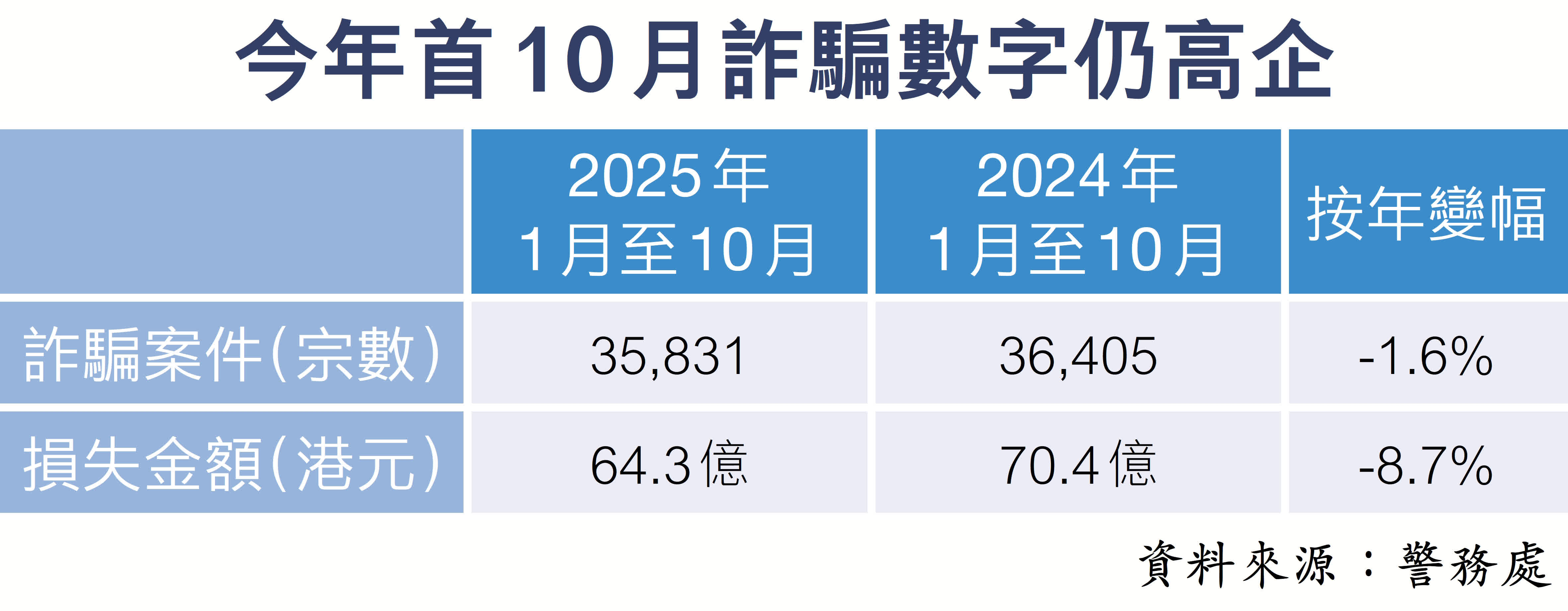 (香港文匯報記者 黃安琪)警方數據顯示,本港今年首10個月錄得35,831宗詐騙案,按年微跌1.6%,港人「被捲款」64.3億元,儘管損失金額按年降8.7%,惟整體騙案造成損失仍處高位。香港金管局與香港銀行公會昨日公布,全港所有零售銀行(包括數字銀行)今日(31日)或之前全面向個人客戶推出「智安存」服務。金管局副總裁阮國恒昨形容,「智安存」並非僅針對長者,而是適用於所有客戶的實用防騙工具,除了能防範經授權轉賬的騙案,更能有效防止銀行戶口資料被盜取及未經授權的交易轉賬。他大力呼籲市民主動使用「智安存」,為銀行存款再增添一道安全鎖。