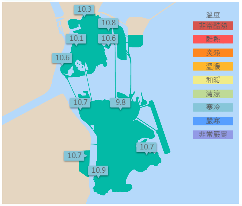 氣象局已發出黃色低溫提示,預料本澳未來數日天氣持續寒冷,一股冬季季風正影響本澳天氣。昨天清晨大潭山錄得最低溫為9.8°C,其他地區徘徊在10°C之內。
