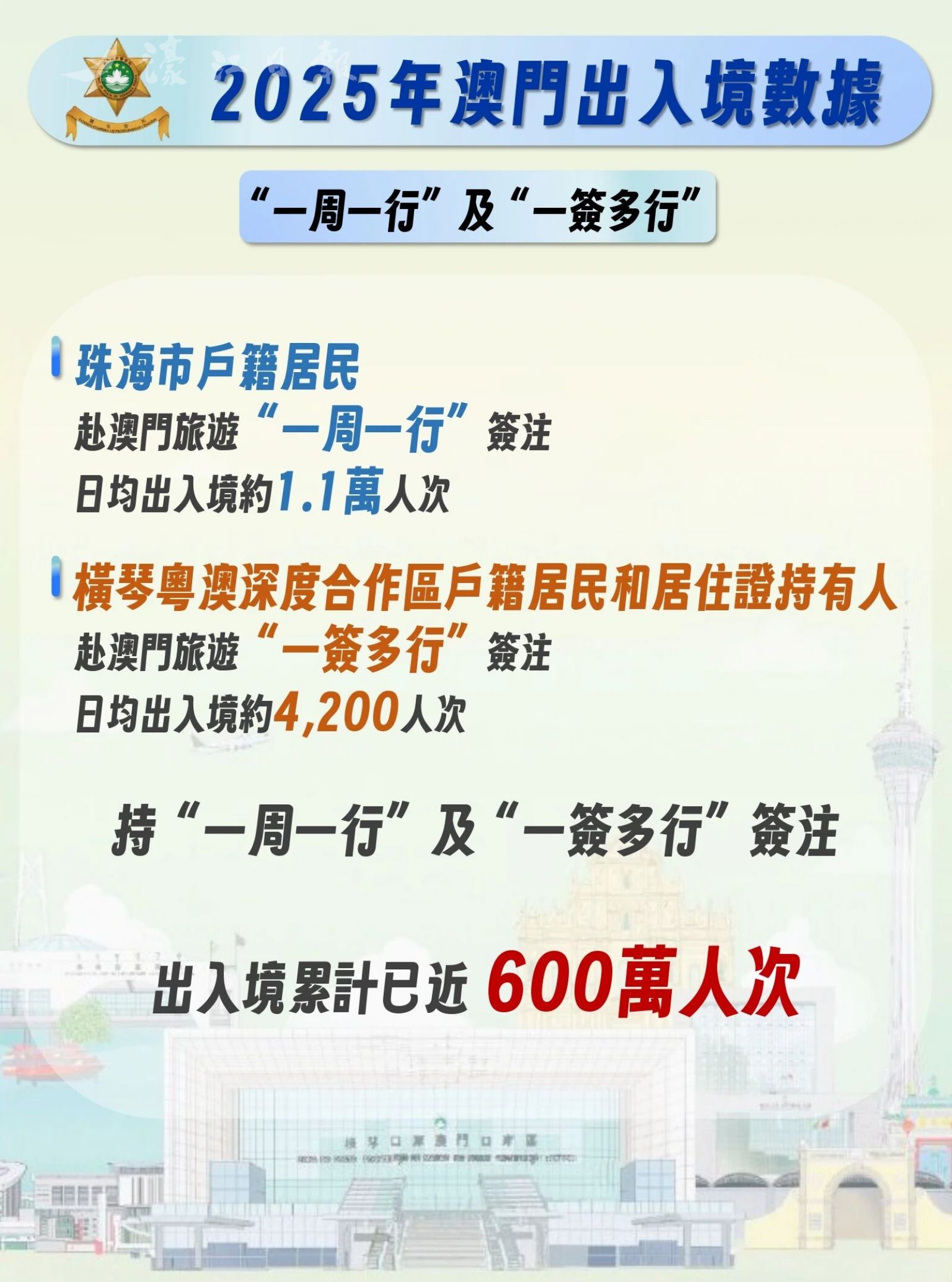 治安警消息:2025年,本澳的出入境總人次再創新高,全澳各個口岸合共錄得2.35億人次出入境,較2024年上升9.8%,入境訪澳旅客4,006萬人次,按年升14.7%,兩項數據均刷新了歷史最高紀錄,另外亦改寫了多項單日出入境人次最高紀錄。