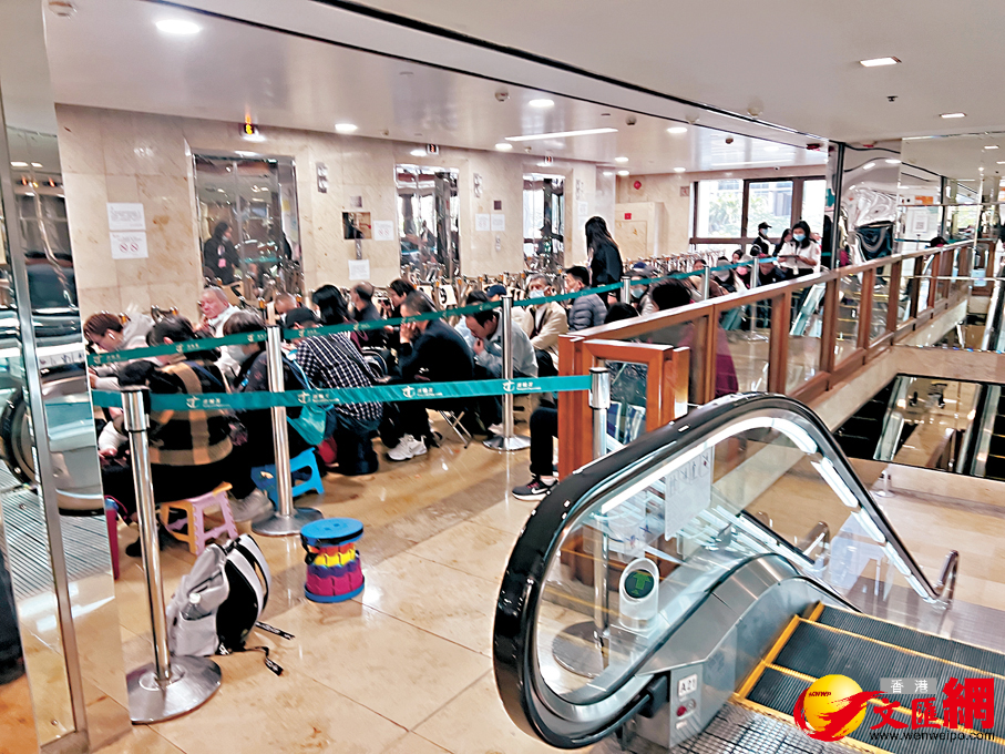 ●中午12時半,排隊黨帶備凳子,擠滿電梯大堂。香港文匯報記者廣濟 攝