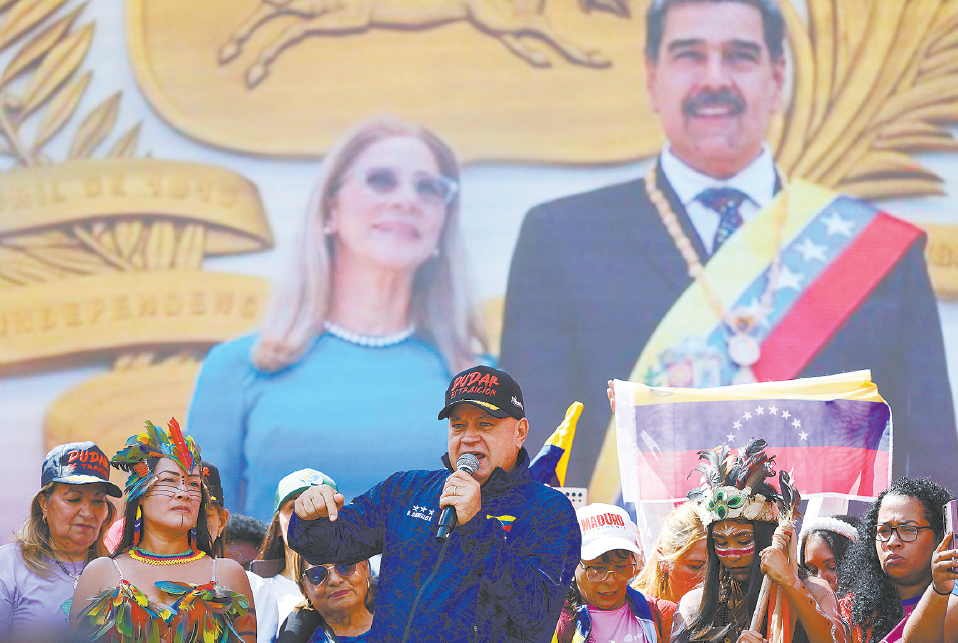 1月6日,加拉加斯,委内瑞拉内政部长卡韦略(前排中)在一场声援马杜罗夫妇的集会上发表讲话。(视觉中国)