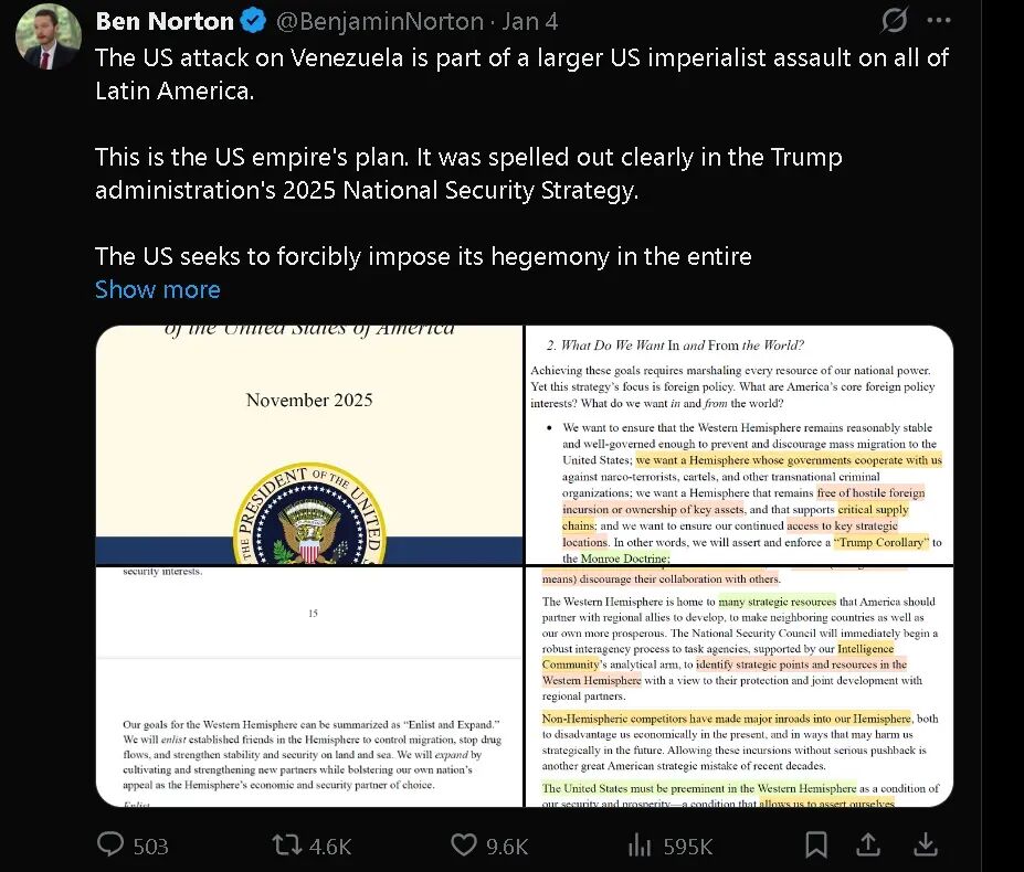 虽然美国《国家安全战略》摆出了一副美国要帮着拉美发展的姿态,但就像诺顿在其帖文中所指出的那样,妄言要“操控委内瑞拉”,并接连对哥伦比亚和古巴等拉美左翼政府做出威胁的美国,真正想要的并不是与拉美人民共同富裕,而是想让拉美人民出卖国家主权,成为被美国压榨的奴工。