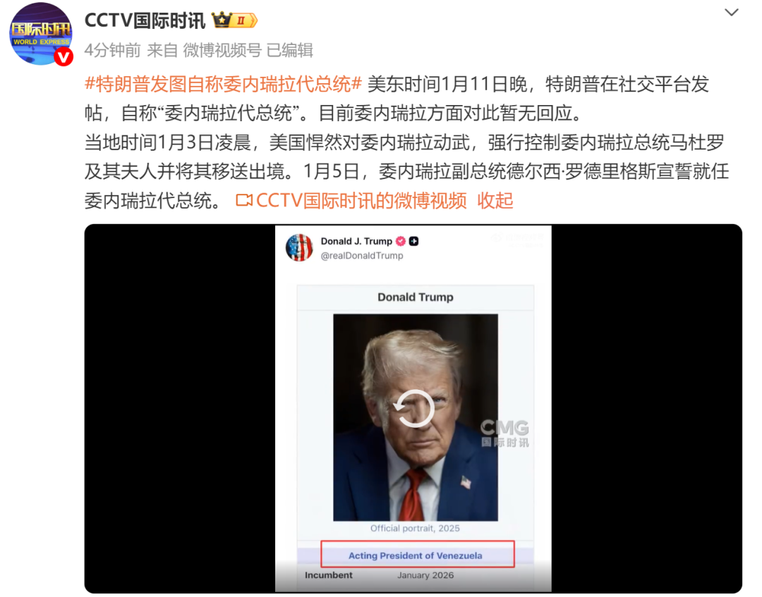 據CCTV國際時訊,美東時間1月11日晚,特朗普在社交平臺發帖,自稱“委內瑞拉代總統”。目前委內瑞拉方面對此暫無回應。