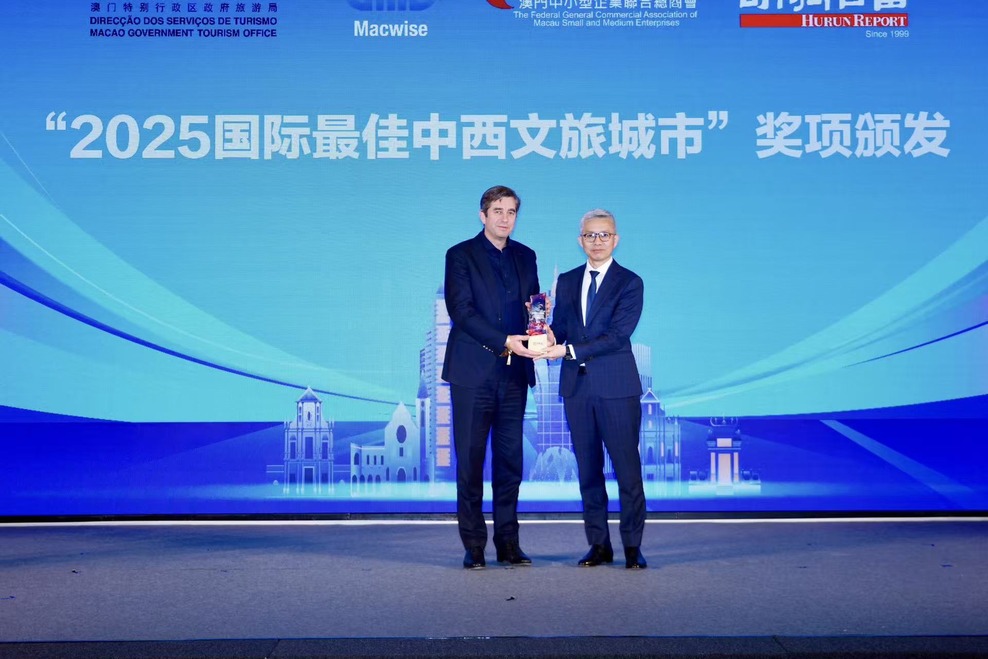 隨後舉行「國際最佳中西文旅城市」獎項頒發儀式,由胡潤親自頒獎、經濟財政司司長戴建業代表領獎。這一榮譽充分彰顯了澳門在文旅綜合實力、國際影響力及城市魅力方面的卓越表現。