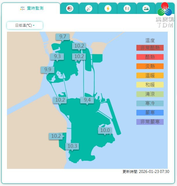 本澳持續受冬季季風影響,今日 (23日) 天氣仍寒冷。氣象局稱,今早各區錄得最低溫約 9℃至 10℃。實時監測顯示,截至早上 7時半,大炮台氣象站錄得 9.3℃低溫;大潭山氣象站亦最低 9.4℃。