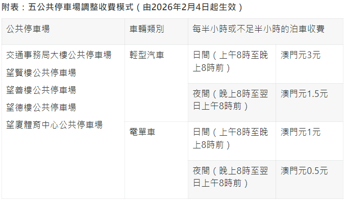 為回應市民短暫泊車需求,提升車位周轉率,交通事務局持續擴大“半小時收費”模式的覆蓋範圍。自2月4日起,將新增5個公共停車場實施該模式,屆時全澳適用此收費的公共停車場將增至32個。