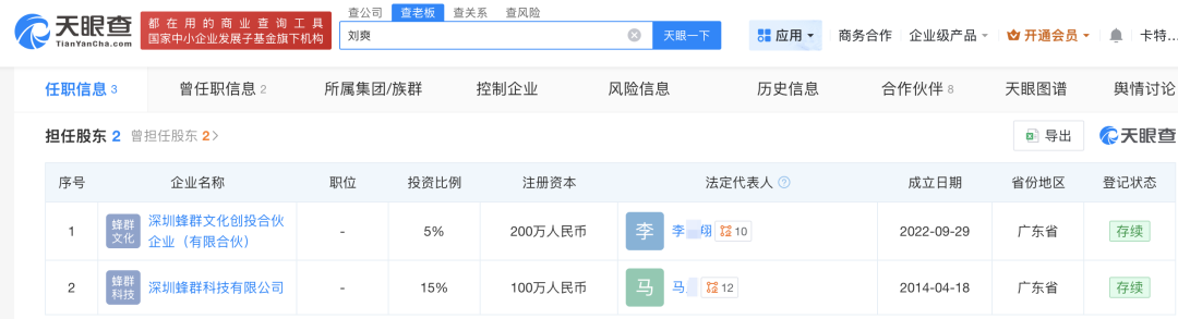 天眼查顯示,留幾手(本名劉爽)持有蜂羣兩家公司的股權,分別爲【深圳蜂羣科技有限公司】、【深圳蜂羣文化創投合夥企業(有限合夥)】。