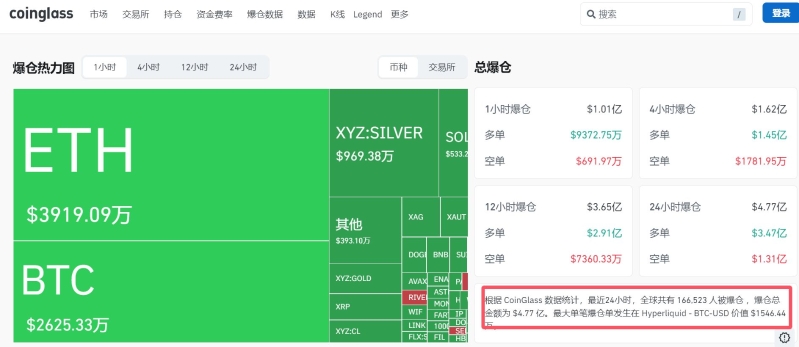 據coinglass顯示,最近24小時,全球共有166470人被爆倉。