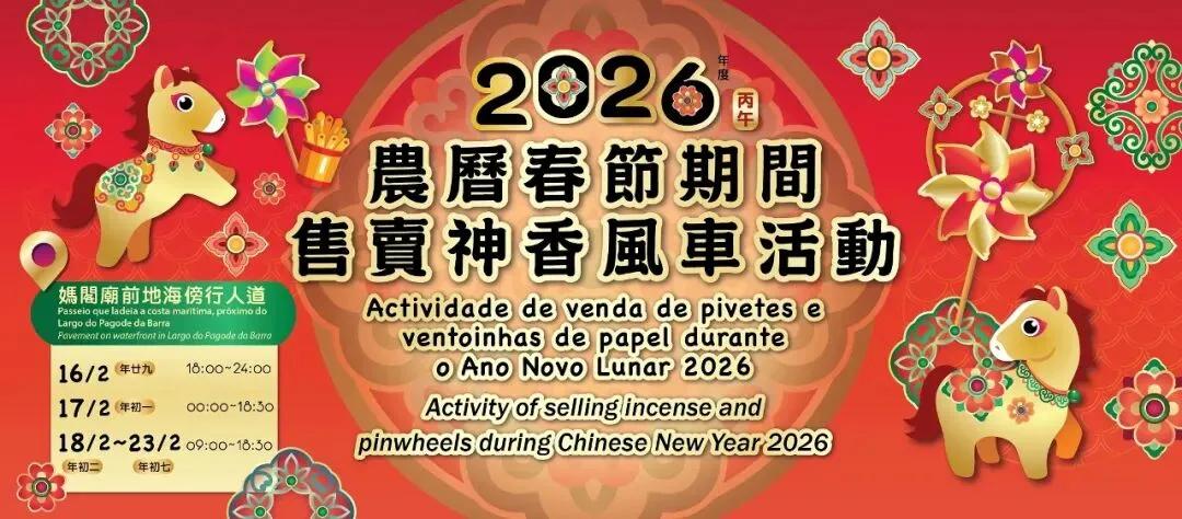 另外,为方便市民购买风车及神香等物品,市政署将于妈阁庙前地海傍行人道设立十个售卖神香、风车的临时摊档,营业时间为2月16日至23日(年廿九至年初七)。