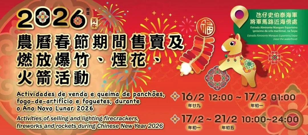 过年又怎么少得了热闹的鞭炮声?为了增加新春节日气氛,市政署将在氹仔史伯泰海军将军马路近海傍一带设置爆竹燃放区,并设六个售卖爆竹、烟花、火箭的摊档,开放时间为2月16日至21日(年廿九至年初五)。