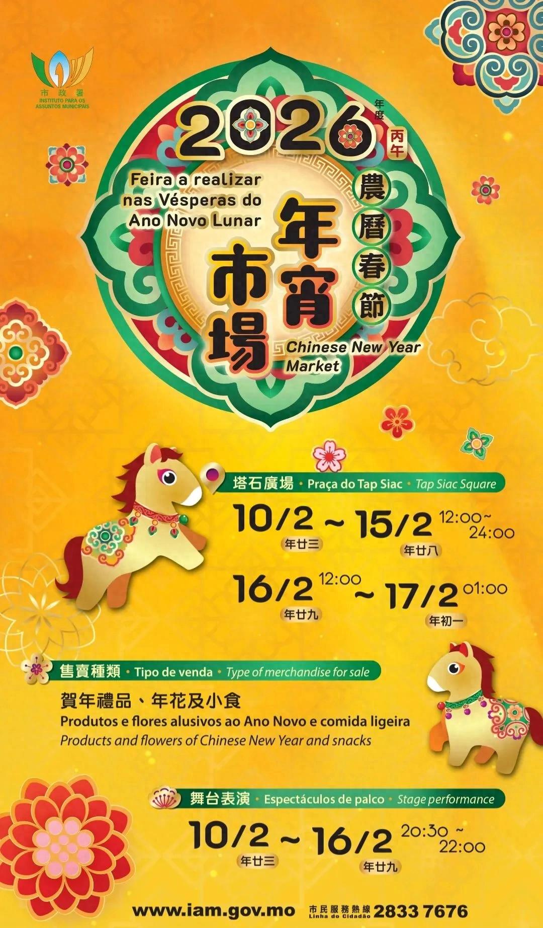 2026年度农历春节年宵市场将于2月10日至17日(年廿三至年初一)在塔石广场举行,售卖贺年礼品、年花及小食,其中10日至16日晚上还设有舞台表演,并设置大型花艺展览及贺年灯饰供观赏,快来选购应节物品吧。