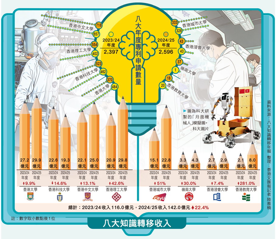 【香港中通社3月19日电】香港八大高校近日发表上一学年的知识转移年报,年内总体知识转移收入约142亿港元,按年增22.4%,再创新高;总体专利申请数增至2596项,多近200项。