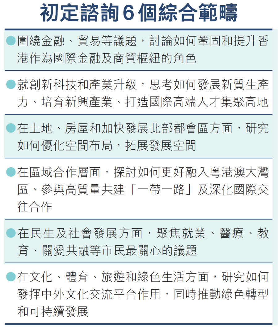 香港特區政府將於今年內完成編制香港五年規劃,署理政制及內地事務局局長胡健民昨日在立法會上透露,局方已初步釐定金融、貿易相關議題;創新科技和產業升級;土地、房屋和加快發展北部都會區;區域合作;民生及社會發展,以及文化、體育、旅遊和綠色生活6個綜合範疇作專題諮詢。特區政府會聯同立法會議員就特定專題舉行諮詢會議,邀請相關政策範疇的界別人士以及持份者參與和提供寶貴意見,全力以赴做好主動對接國家「十五五」規劃的工作。
