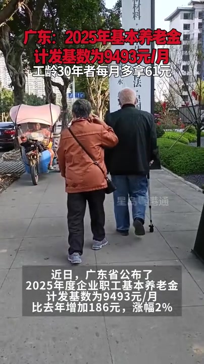 广东:2025年基本养老金计发基数为9493元/月,工龄30年者每月多拿61元