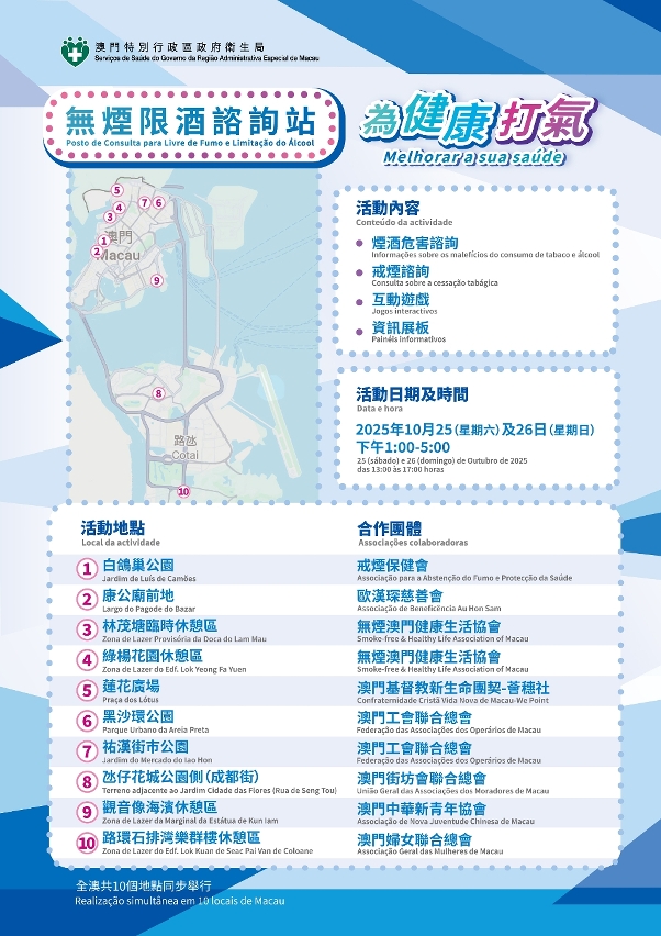 卫生局联同社团于本周六、日举办“无烟限酒咨询站”活动